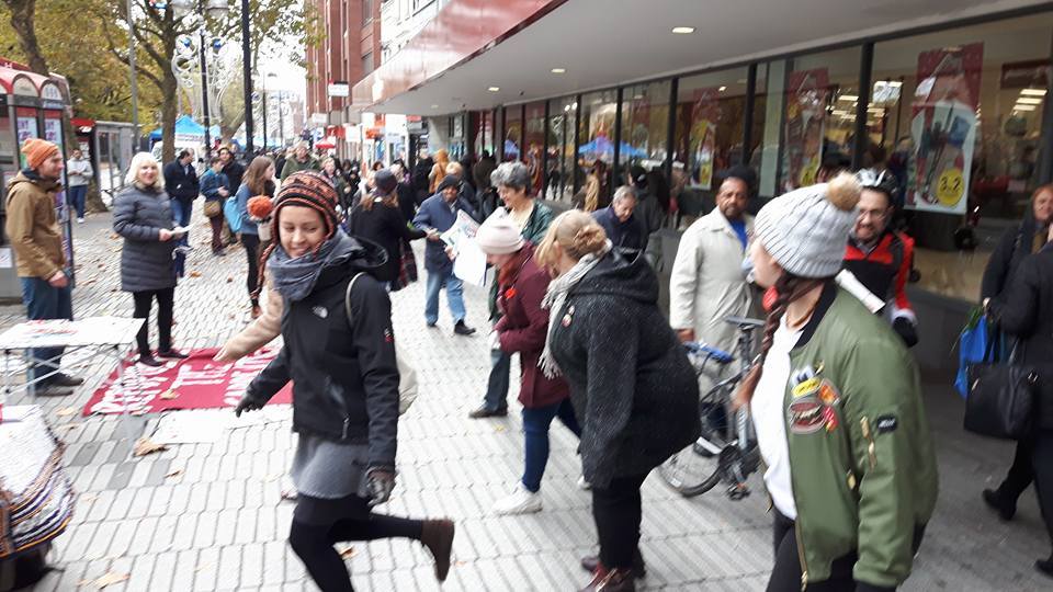 We took them along to our weekly street stall in Stratford outside Wilkos on the Broadway for leafleting, petitioning, using the open mic and of course a bit of street dancing: