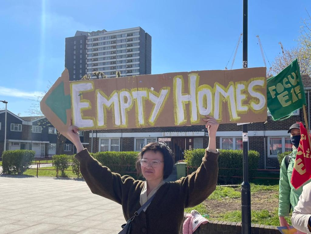 On Saturday 17 April we marched, with noise and energy, from Brimstone House to the Carpenters Estate. It is shocking and enraging to see the almost empty tower blocks on the Carpenters Estate – council flats left empty for over ten years, whilst we know that families with children in Brimstone House are crammed into unsuitable accommodation which is unfit and unhealthy for children.