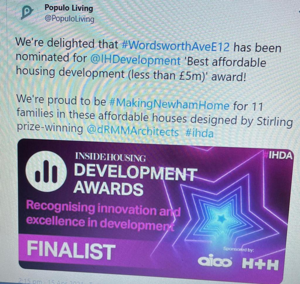 At the same time as the residents from Brimstone House were on the march and demanding to be moved, the Mayor of Newham, in a parallel universe was patting herself on the back and sharing a tweet from Populo living, Newham council’s housing company: