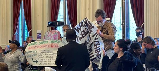 As the interruption of the council meeting began, security ran forward to silence the campaigners and take the banners away, but their voices were heard above the commotion explaining to the large crowd why this was necessary and that the appalling living conditions for so many in the borough must not be below the radar and buried from public view.