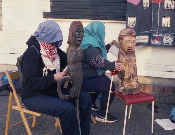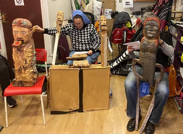 Figure 6 Left to right. Garyleena made from wood found in the Thames Near East London and Nelly Nogood are both known characters to campaign members with complex histories. (analogue photo C.Walker)